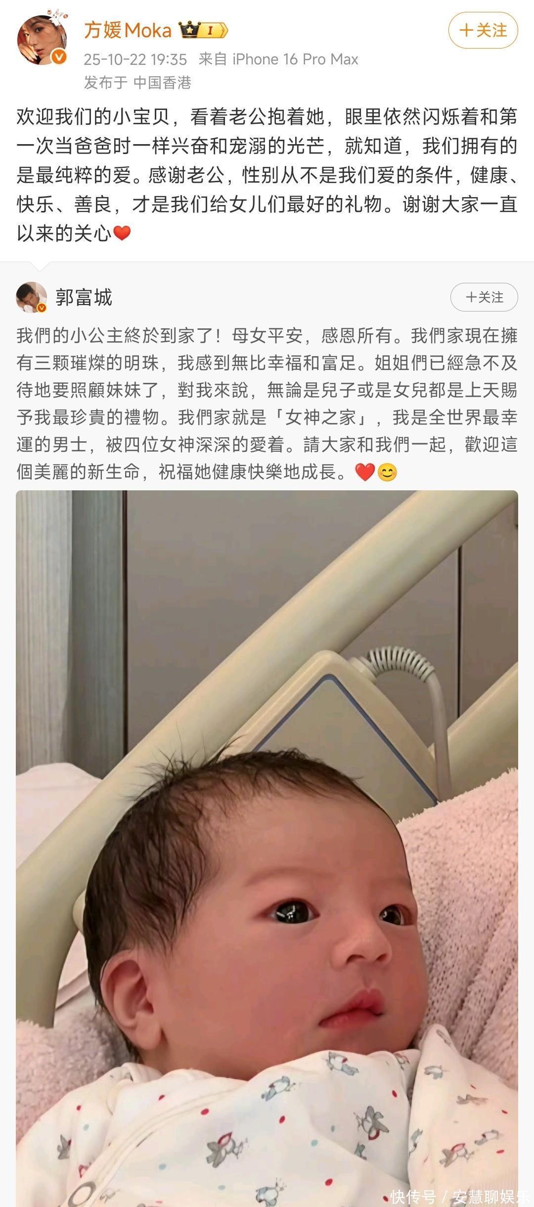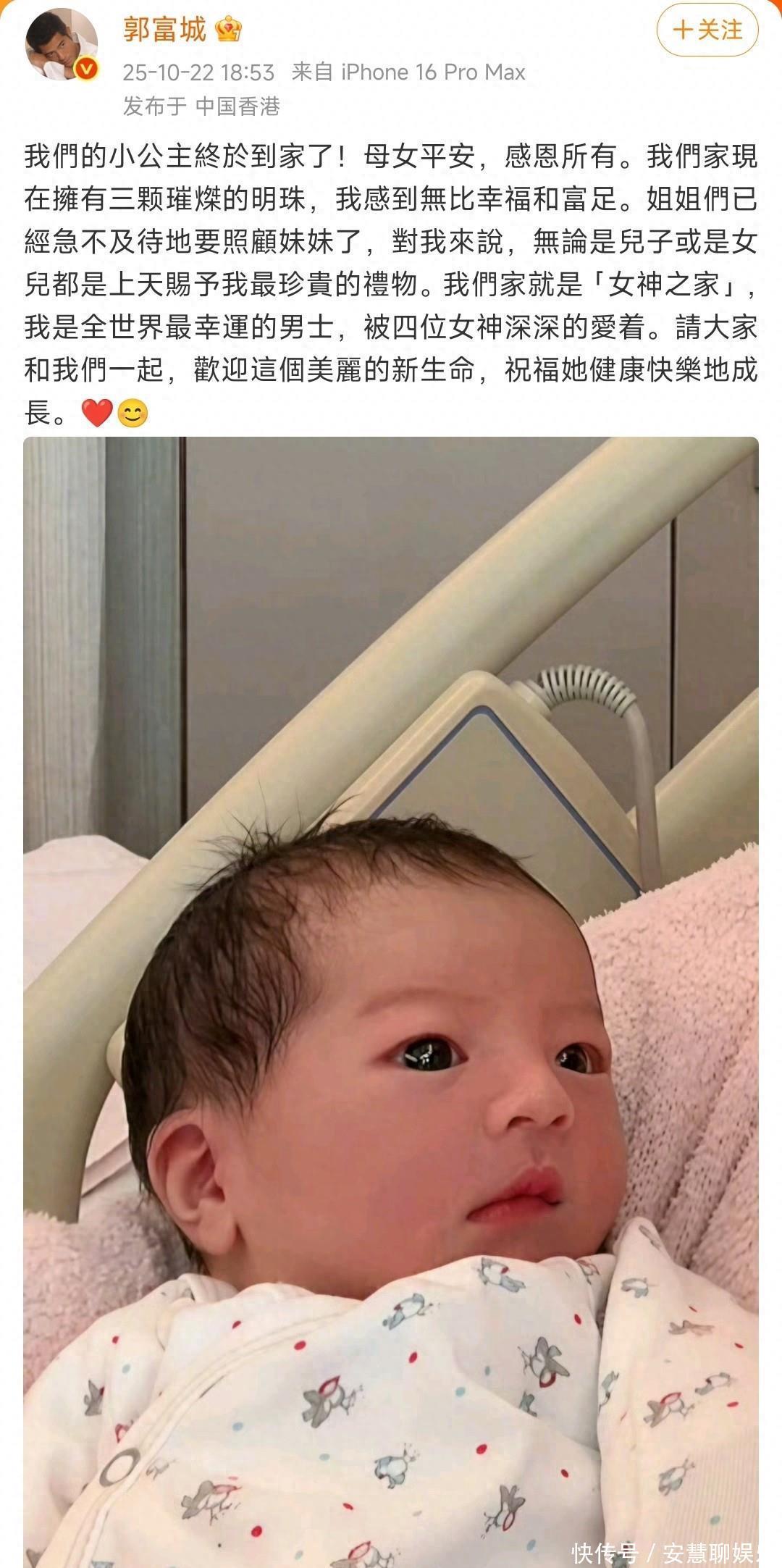 到了 10 月 22 号下午,大家期待的时刻终于来了。郭富城穿着黑色的衣服,戴着鸭舌帽,亲自开车带着岳父母去了香港养和医院,准备接三胎宝宝回家。同行的还有小心翼翼提着婴儿篮的两名护士。郭富城一路上都紧紧跟着,眼睛一刻也不敢离开婴儿篮,生怕宝贝有个闪失。面对记者的道喜,郭富城虽然戴着口罩和墨镜,但从他“多谢”的回答和微微眯起的眼睛,能看出来他心情很不错。不过当记者问到没同行的妻子方媛的状况时,护妻心切的郭富城就选择闭口不谈了。很快,郭富城就在社交平台上发文官宣了这个好消息。他说“我们的小公主终于到家了!母女平安,感恩所有。”就这么短短十几个字,却把新生命到来的安稳和感激都表达得清清楚楚。他还把三个女儿比作“三颗璀璨的明珠”,说“我们家现在拥有三颗璀璨的明珠,我感到无比幸福和富足”,能看出来他对女儿们那是打心底里的珍视。他还提到“姐姐们已经急不及待地要照顾妹妹了”,这画面想想都温馨,两个姐姐围着小婴儿,眼睛里满是好奇和关爱。他还很通透地表示“对我来说,无论是儿子或是女儿都是上天赐予我最珍贵的礼物”,还把自家定义为“女神之家”,说自己是“全世界最幸运的男士,被四位女神深深地爱着”,这里面既包含了对妻子方媛的珍视,也满是对三个女儿的宠溺。方媛也发文回应了三胎得女这件事。她写得特别感人,说看着老公抱着小女儿,眼里还是和第一次当爸爸时一样,闪烁着兴奋和宠溺的光芒,就知道他们拥有的是最纯粹的爱。她还说感谢老公,性别从不是他们爱的条件,健康、快乐、善良,才是他们给女儿们最好的礼物。这一家人的感情真好,让人看了特别羡慕。